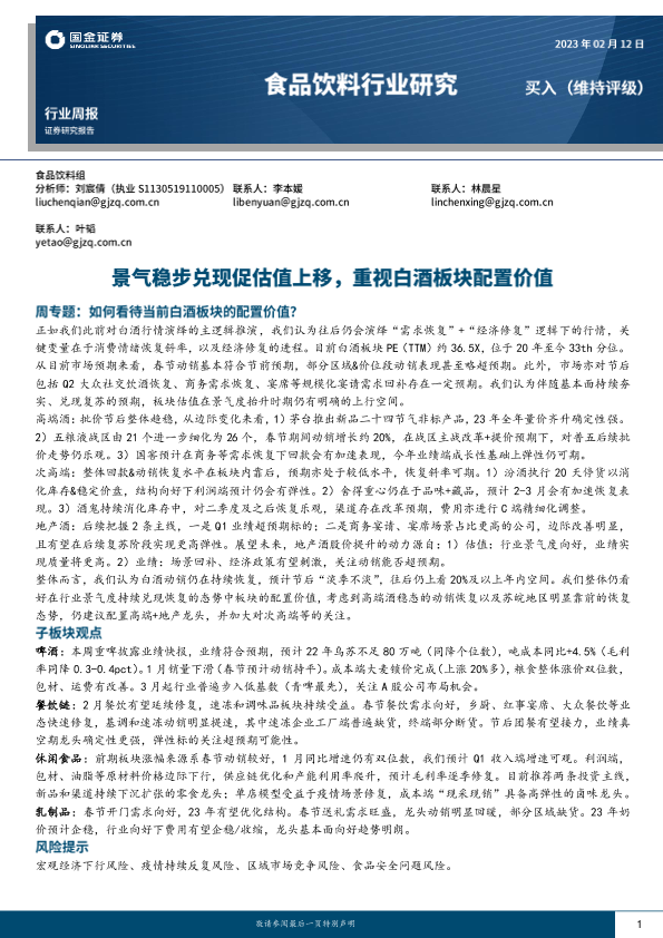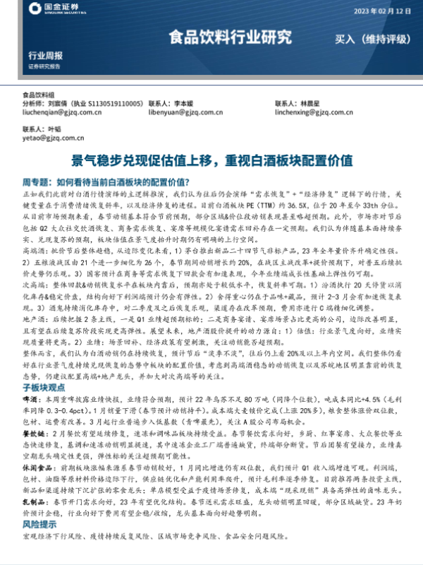 【国金证券】【20230212】20230212-国金证券-食品饮料行业研究:景气稳步兑现促估值上移,重视白酒板块配置价值-13页