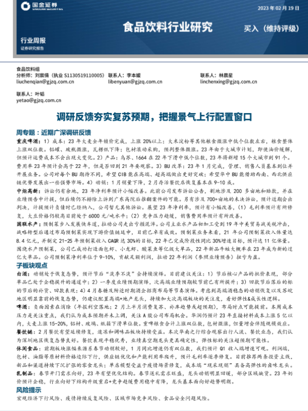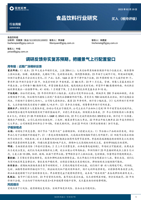 【国金证券】【20230219】20230219-国金证券-食品饮料行业研究:调研反馈夯实复苏预期,把握景气上行配置窗口-11页