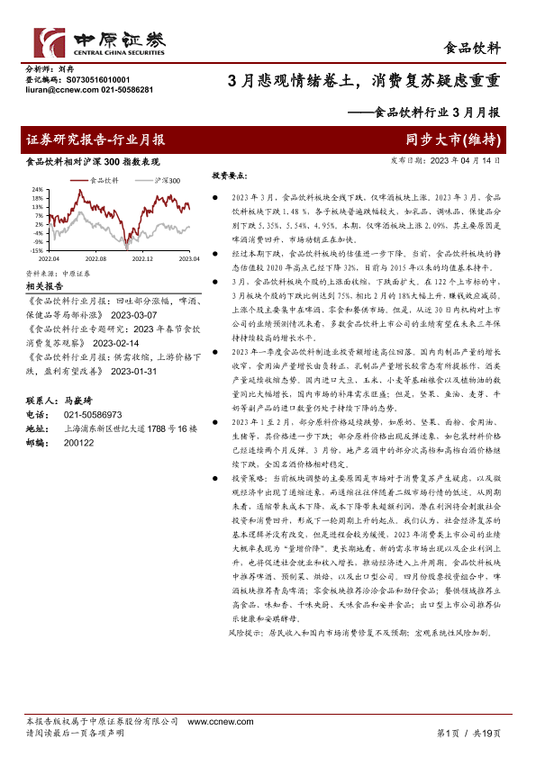【中原证券】【20230414】食品饮料行业3月月报:3月悲观情绪卷土,消费复苏疑虑重重-19页