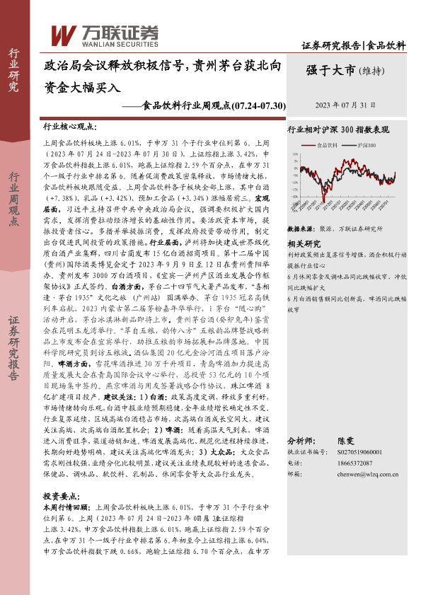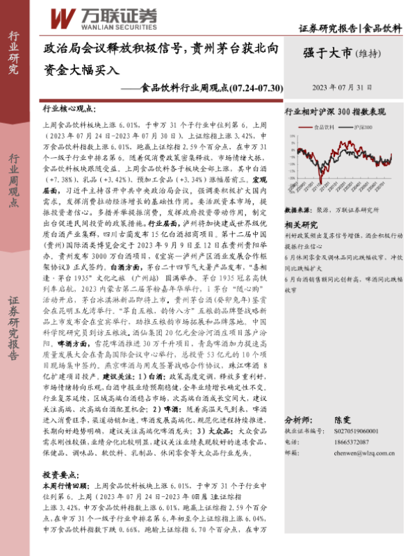 【万联证券】【20230731】20230731-万联证券-食品饮料行业周观点:政治局会议释放积极信号,贵州茅台获北向资金大幅买入-14页