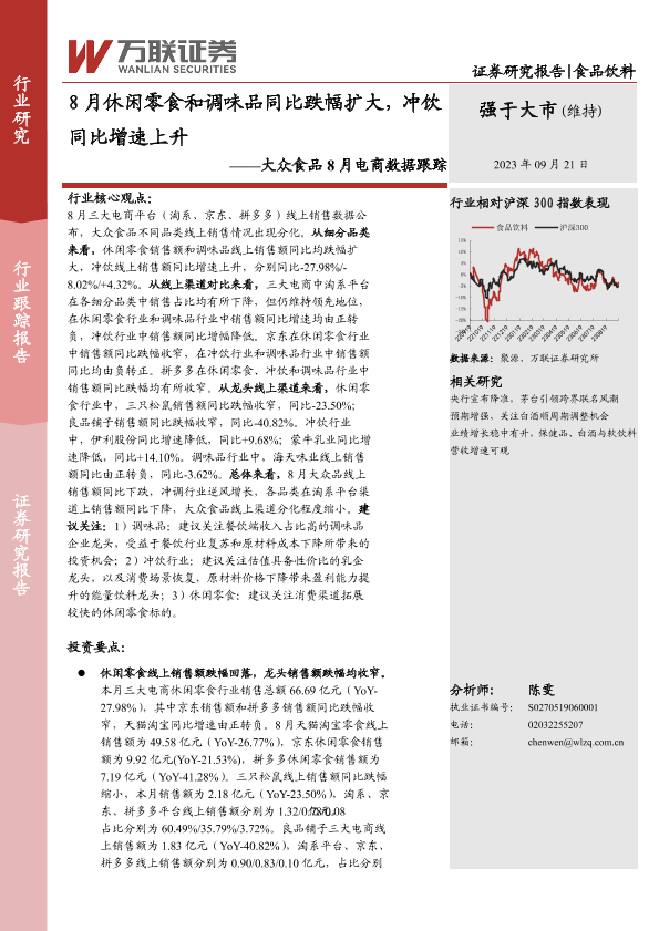 【万联证券】【20230921】20230921-万联证券-大众食品8月电商数据跟踪:8月休闲零食和调味品同比跌幅扩大,冲饮同比增速上升-13页