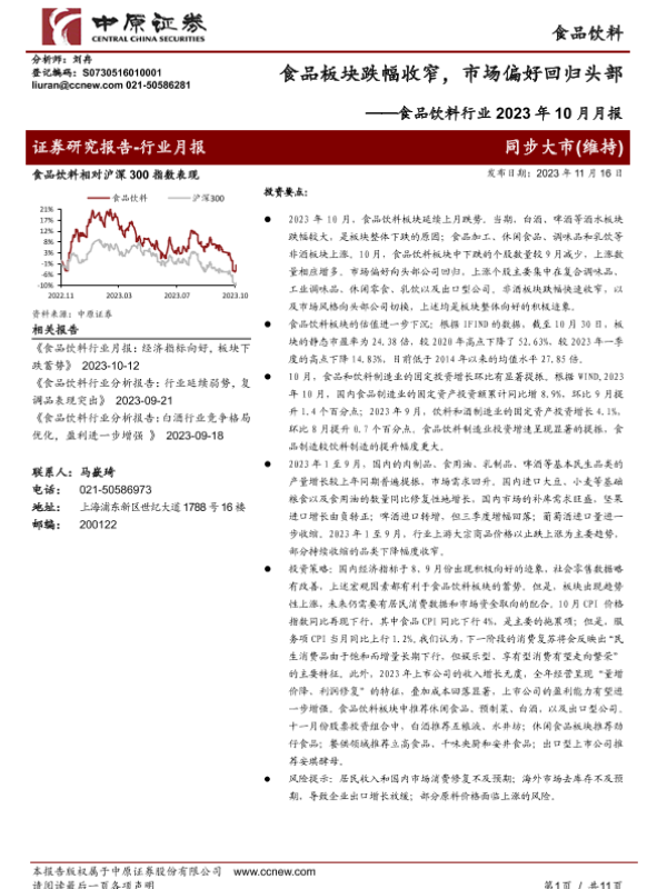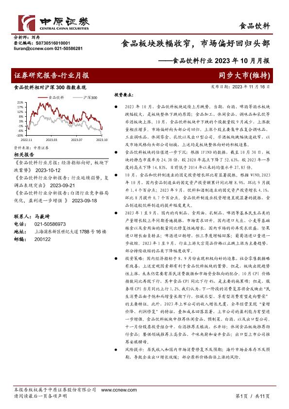 【中原证券】【20231116】食品饮料行业2023年10月月报:食品板块跌幅收窄,市场偏好回归头部-11页