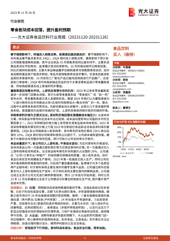 【光大证券】【20231126】食品饮料行业周报:零食板块成本回落,提升盈利预期-10页