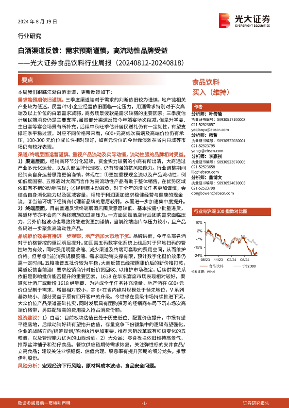 【光大证券】【20240819】20240819-光大证券-食品饮料行业周报-白酒渠道反馈:需求预期谨慎,高流动性品牌受益-10页