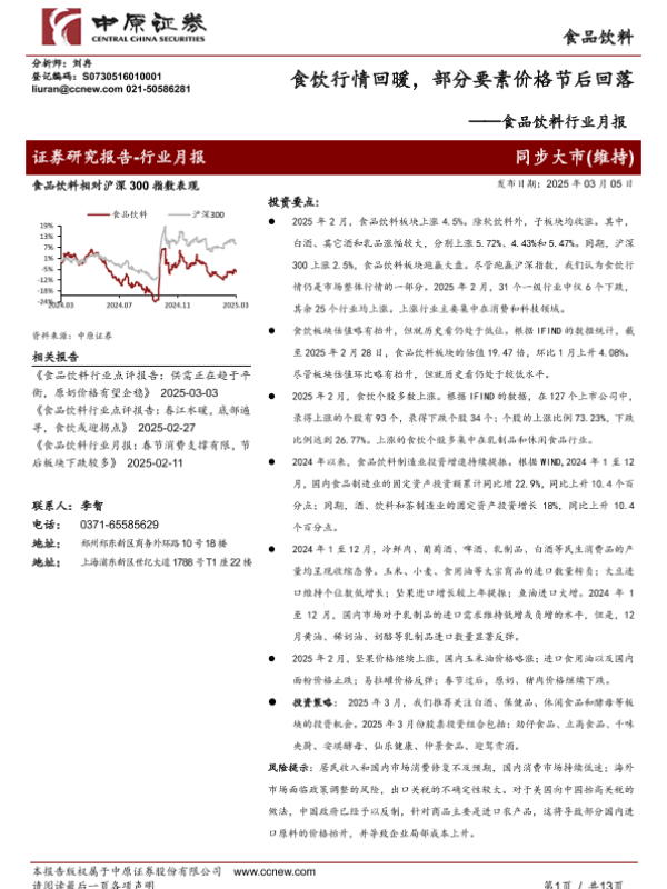 【中原证券】【20250305】食品饮料行业月报:食饮行情回暖,部分要素价格节后回落-13页