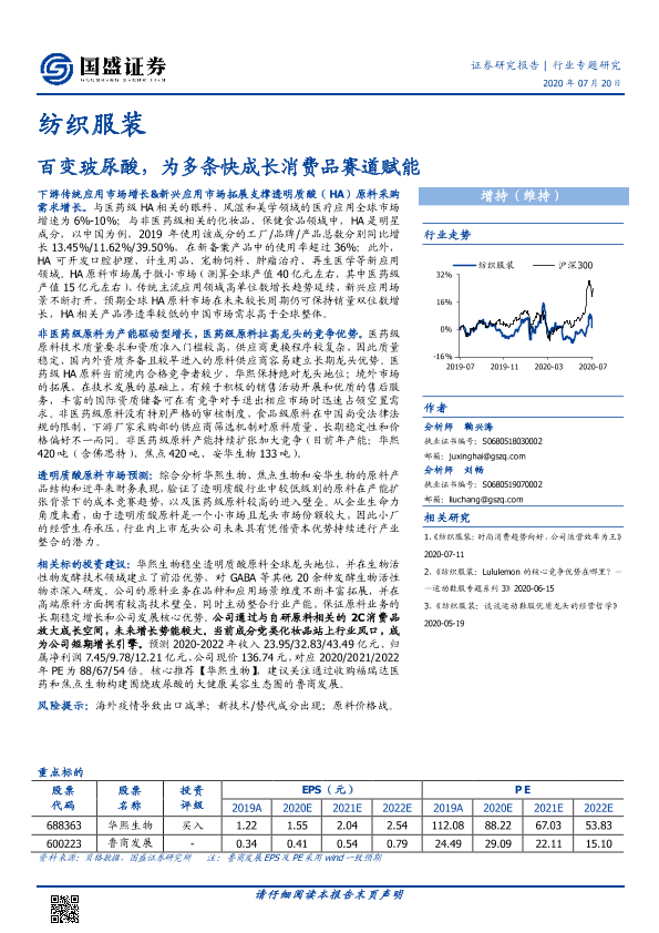 【国盛证券】【20200720】20200720-国盛证券-纺织服装行业专题研究:百变玻尿酸,为多条快成长消费品赛道赋能-14页