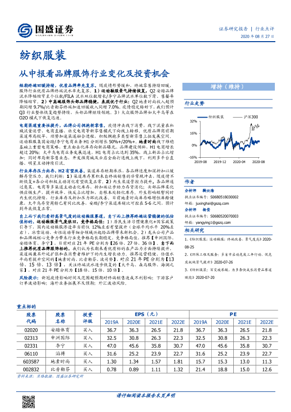 【国盛证券】【20200827】从中报看品牌服饰行业变化及投资机会-2页