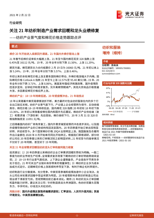 【光大证券】【20210222】纺织产业景气度和棉花价格走势跟踪点评:关注21年纺织制造产业需求回暖和龙头业绩修复-4页