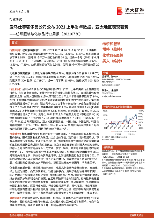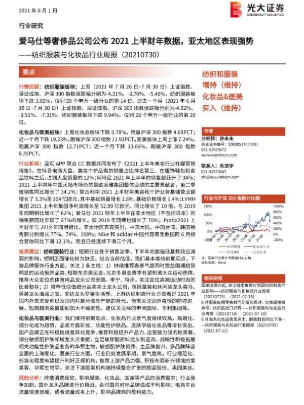 【光大证券】【20210801】20210801-光大证券-纺织服装与化妆品行业周报:爱马仕等奢侈品公司公布2021上半财年数据,亚太地区表现强势-12页