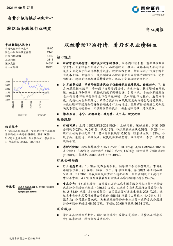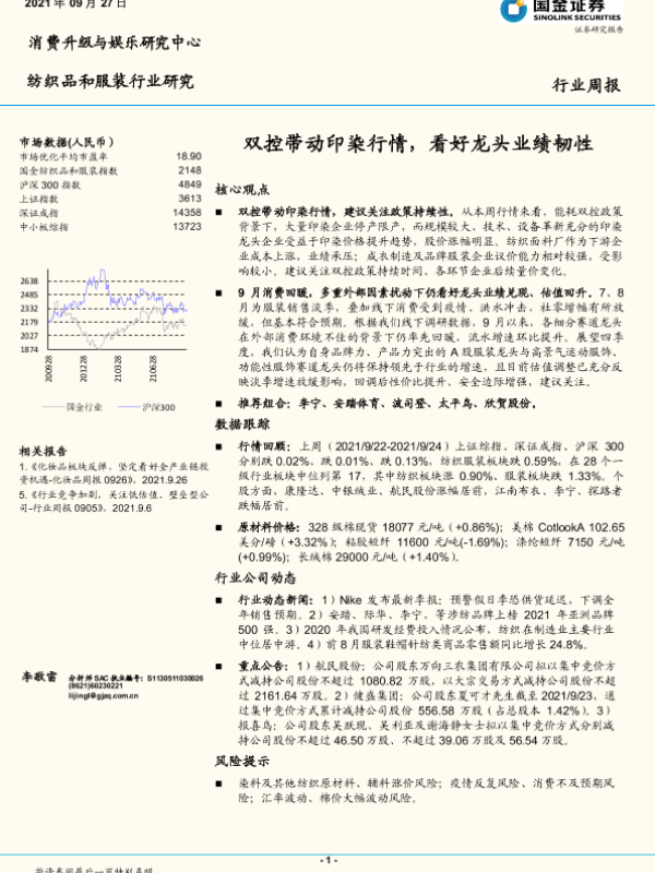 【国金证券】【20210927】20210927-国金证券-纺织品和服装行业研究周报:双控带动印染行情,看好龙头业绩韧性-11页