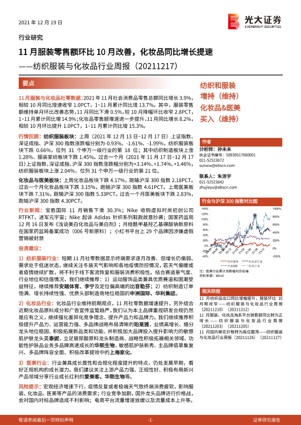 【光大证券】【20211219】20211219-光大证券-纺织服装与化妆品行业周报:11月服装零售额环比10月改善,化妆品同比增长提速-12页