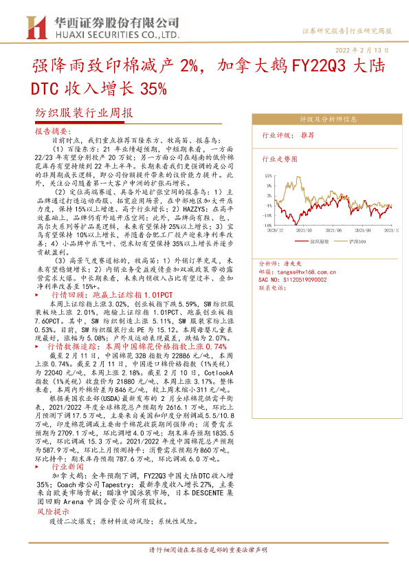 【华西证券】【20220213】20220213-华西证券-纺织服装行业周报:强降雨致印棉减产2%,加拿大鹅FY22Q3大陆DTC收入增长35%-15页