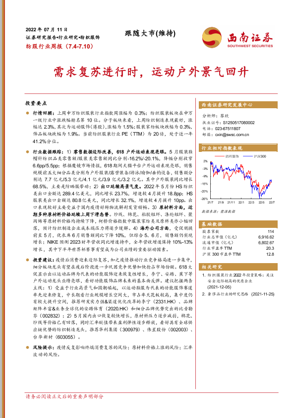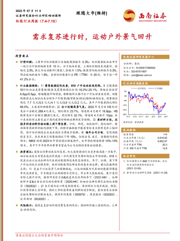 【西南证券】【20220711】20220711-西南证券-纺服行业周报:需求复苏进行时,运动户外景气回升-13页