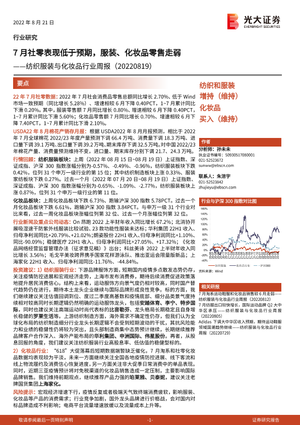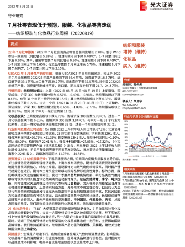 【光大证券】【20220821】20220821-光大证券-纺织服装与化妆品行业周报:7月社零表现低于预期,服装、化妆品零售走弱-11页