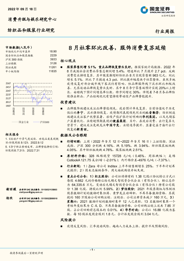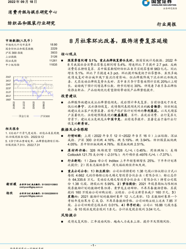 【国金证券】【20220918】20220918-国金证券-纺织品和服装行业研究:8月社零环比改善,服饰消费复苏延续-12页