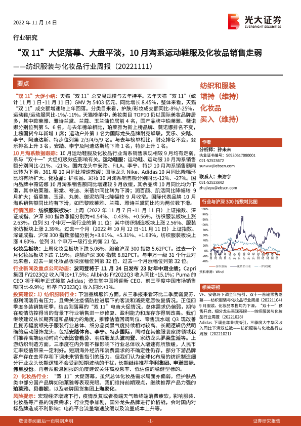 【光大证券】【20221114】20221114-光大证券-纺织服装与化妆品行业周报:“双11”大促落幕、大盘平淡,10月淘系运动鞋服及化妆品销售走弱-14页