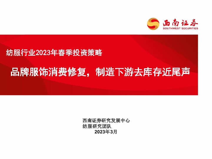 【西南证券】【202303】纺服行业2023年春季投资策略:品牌服饰消费修复,制造下游去库存近尾声-15页