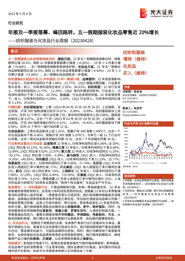 【光大证券】【20230504】20230504-光大证券-纺织服装与化妆品行业周报:年报及一季报落幕、峰回路转,五一假期服装化妆品零售近20%增长-20页