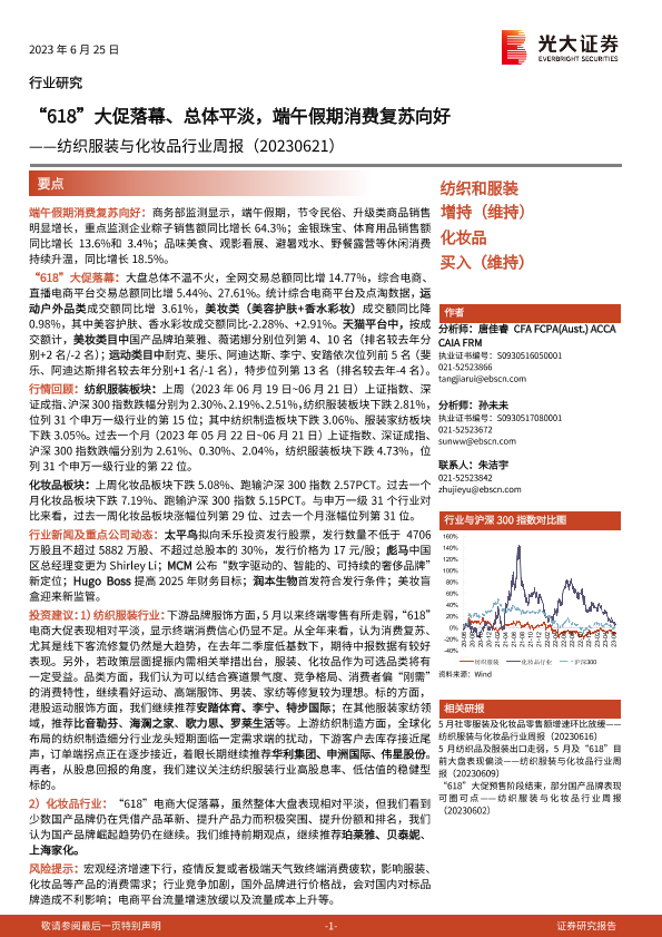 【光大证券】【20230625】20230625-光大证券-纺织服装与化妆品行业周报:“618”大促落幕、总体平淡,端午假期消费复苏向好-12页