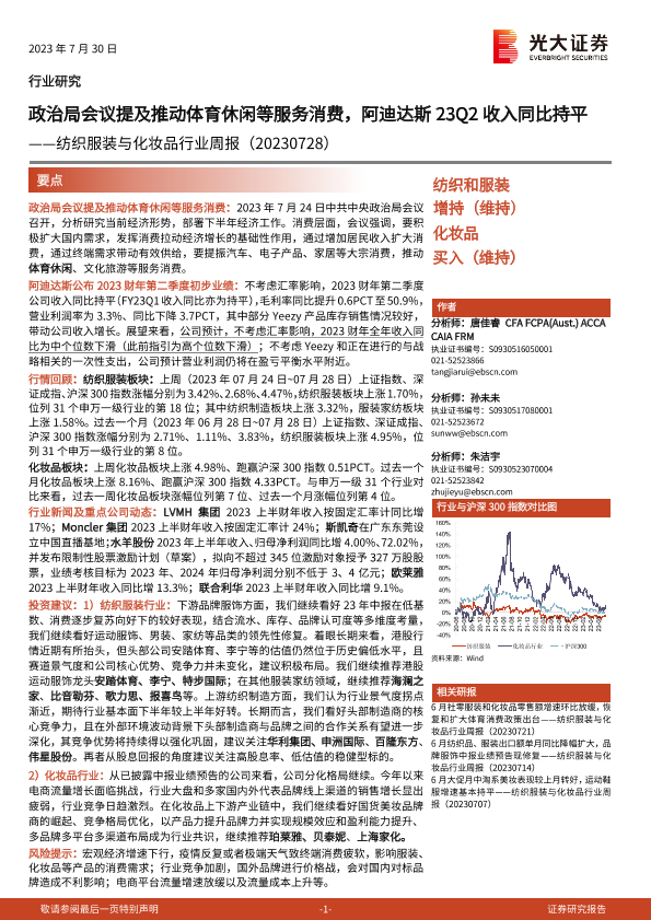 【光大证券】【20230730】20230730-光大证券-纺织服装与化妆品行业周报:政治局会议提及推动体育休闲等服务消费,阿迪达斯23Q2收入同比持平-10页