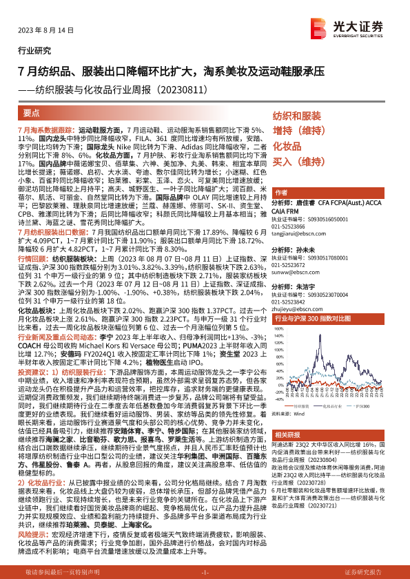 【光大证券】【20230814】20230814-光大证券-纺织服装与化妆品行业周报:7月纺织品、服装出口降幅环比扩大,淘系美妆及运动鞋服承压-13页