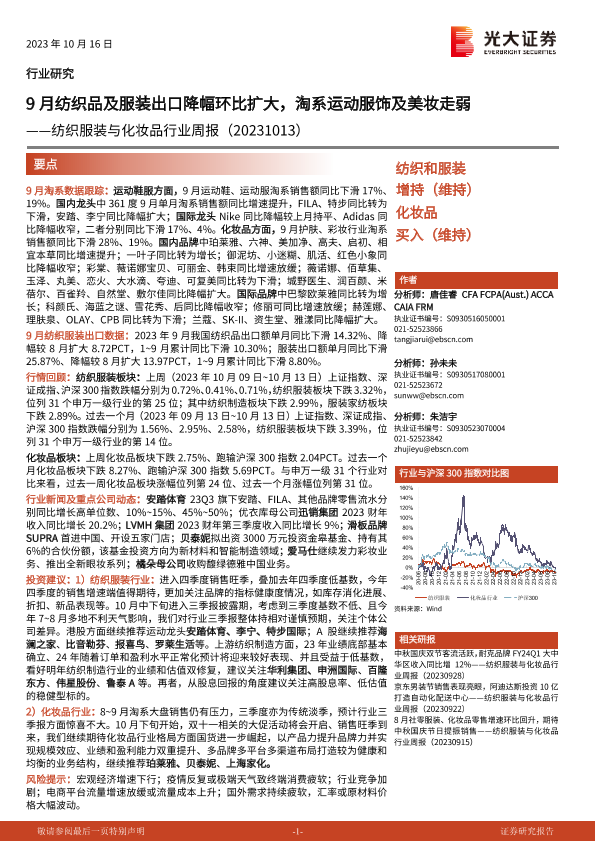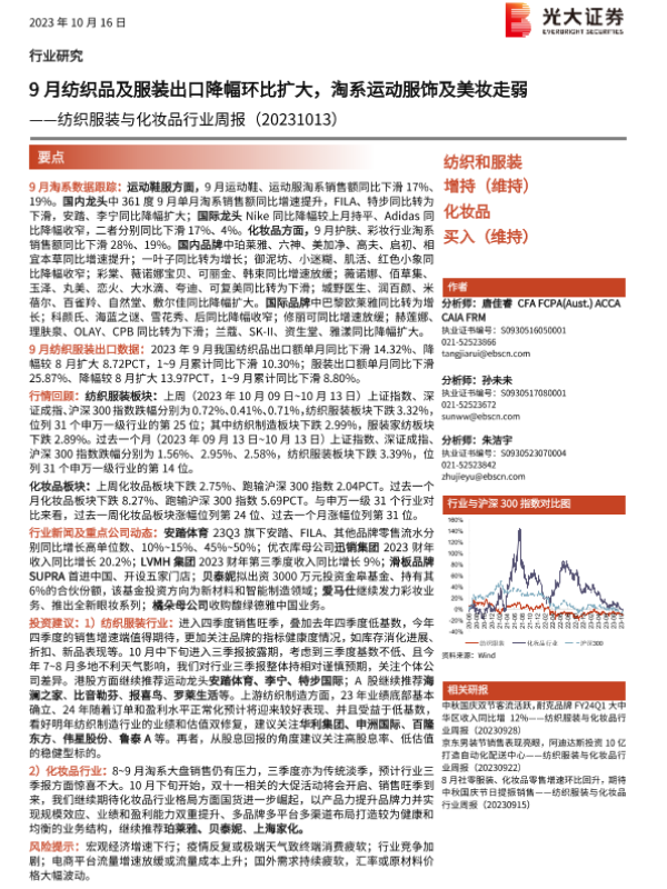 【光大证券】【20231016】20231016-光大证券-纺织服装与化妆品行业周报:9月纺织品及服装出口降幅环比扩大,淘系运动服饰及美妆走弱-13页