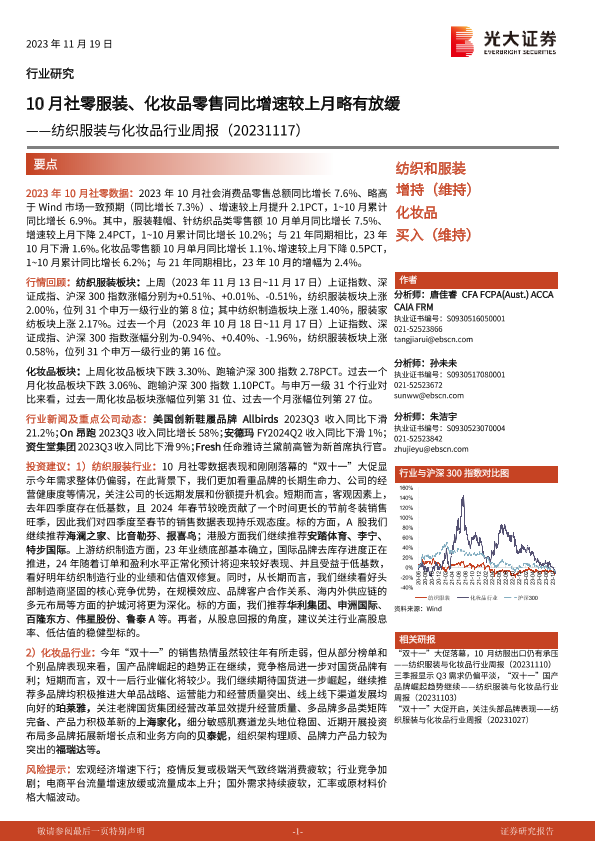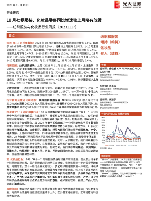 【光大证券】【20231119】20231119-光大证券-纺织服装与化妆品行业周报:10月社零服装、化妆品零售同比增速较上月略有放缓-11页