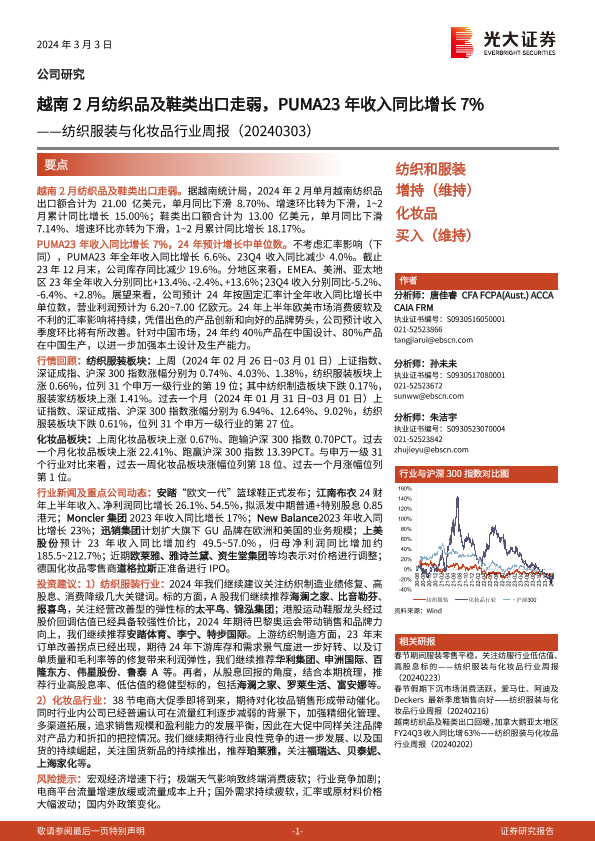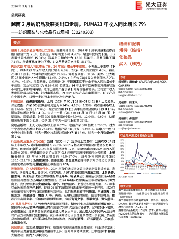 【光大证券】【20240303】20240303-光大证券-纺织服装与化妆品行业周报:越南2月纺织品及鞋类出口走弱,PUMA23年收入同比增长7%-12页