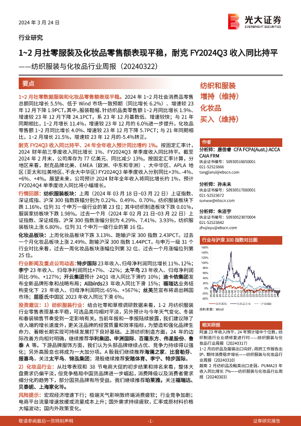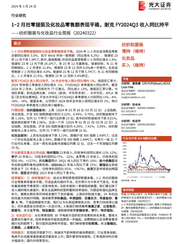 【光大证券】【20240324】20240324-光大证券-纺织服装与化妆品行业周报:1-2月社零服装及化妆品零售额表现平稳,耐克FY2024Q3收入同比持平-12页