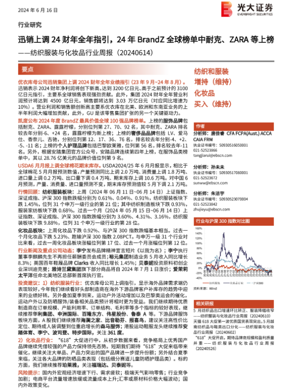 【光大证券】【20240616】20240616-光大证券-纺织服装与化妆品行业周报:迅销上调24财年全年指引,24年BrandZ全球榜单中耐克、ZARA等上榜-11页