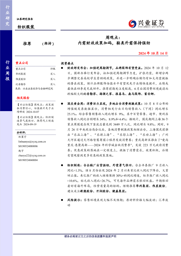 【兴业证券】【20241014】20241014-兴业证券-纺织服装行业周观点:内需财政政策加码,鞋类外需保持强劲-15页