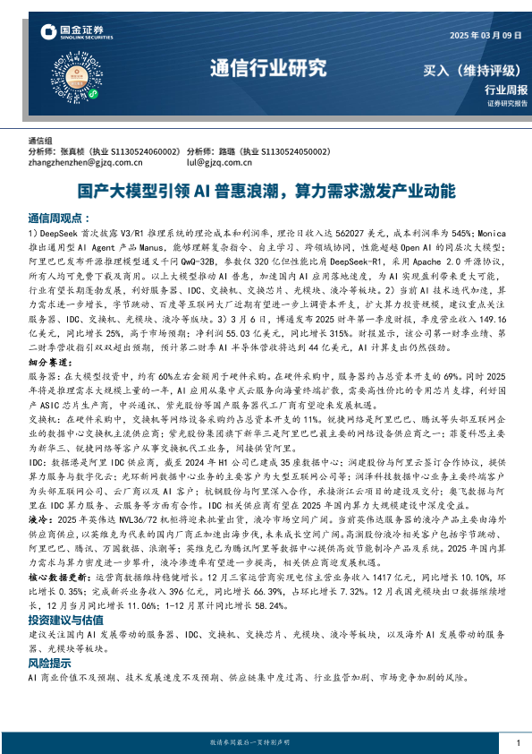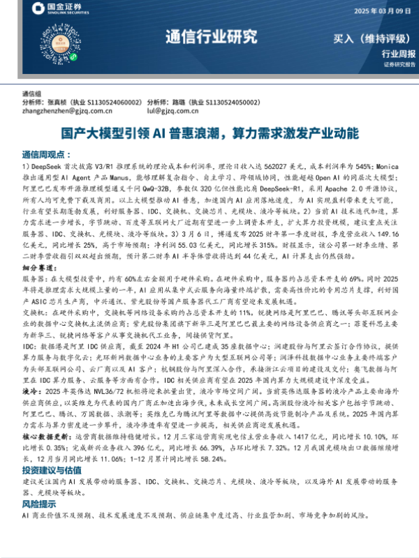 【国金证券】【20250309】国金证券-通信行业周报:国产大模型引领AI普惠浪潮,算力需求激发产业动能-11页