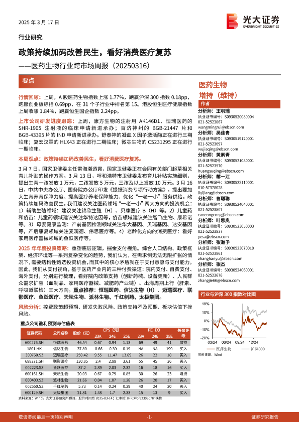 【光大证券】【20250317】医药生物行业跨市场周报:政策持续加码改善民生,看好消费医疗复苏-15页