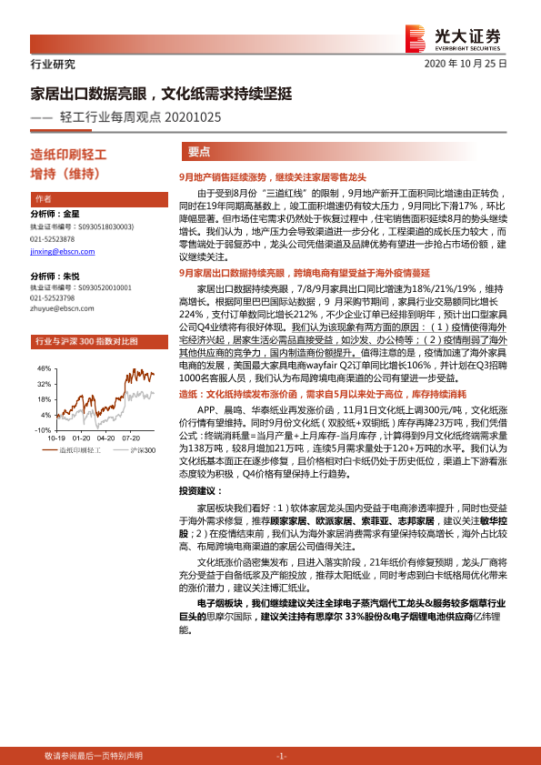 【光大证券】【20201025】轻工行业每周观点:家居出口数据亮眼,文化纸需求持续坚挺-7页