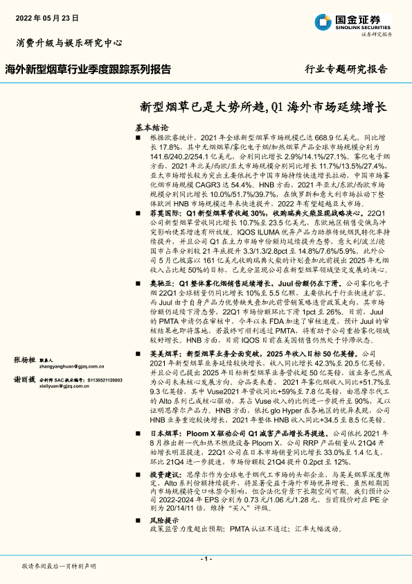 【国金证券】【20220523】海外新型烟草行业季度跟踪系列报告:新型烟草已是大势所趋,Q1海外市场延续增长-26页