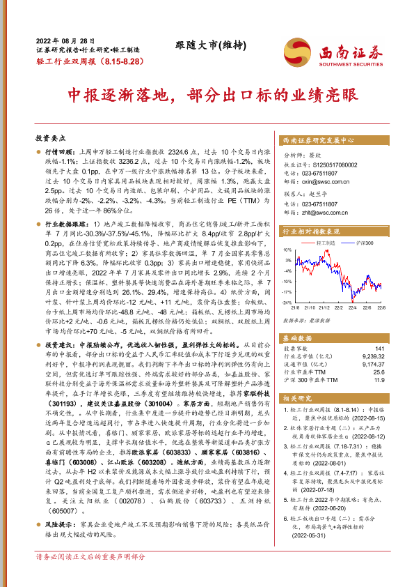 【西南证券】【20220828】20220828-西南证券-轻工行业双周报:中报逐渐落地,部分出口标的业绩亮眼-15页