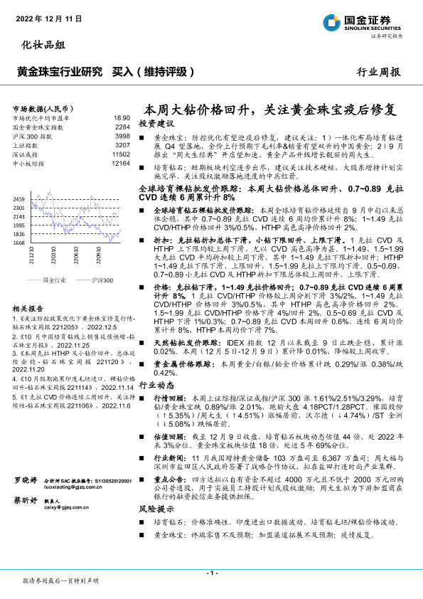 【国金证券】【20221211】20221211-国金证券-黄金珠宝行业研究:本周大钻价格回升,关注黄金珠宝疫后修复-17页