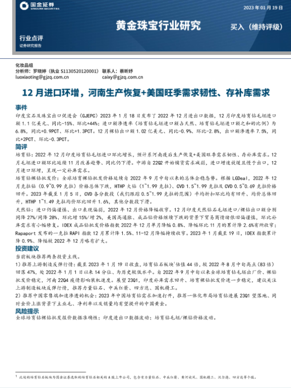 【国金证券】【20230119】20230119-国金证券-黄金珠宝行业点评:12月进口环增,河南生产恢复+美国旺季需求韧性、存补库需求-10页