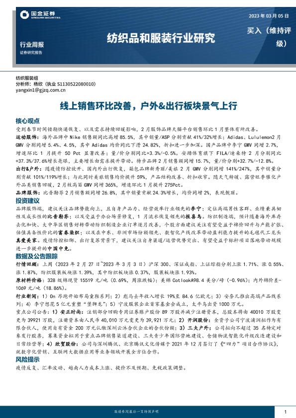 【国金证券】【20230305】20230305-国金证券-纺织品和服装行业研究:线上销售环比改善,户外&出行板块景气上行-12页
