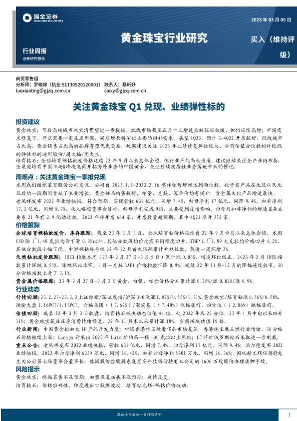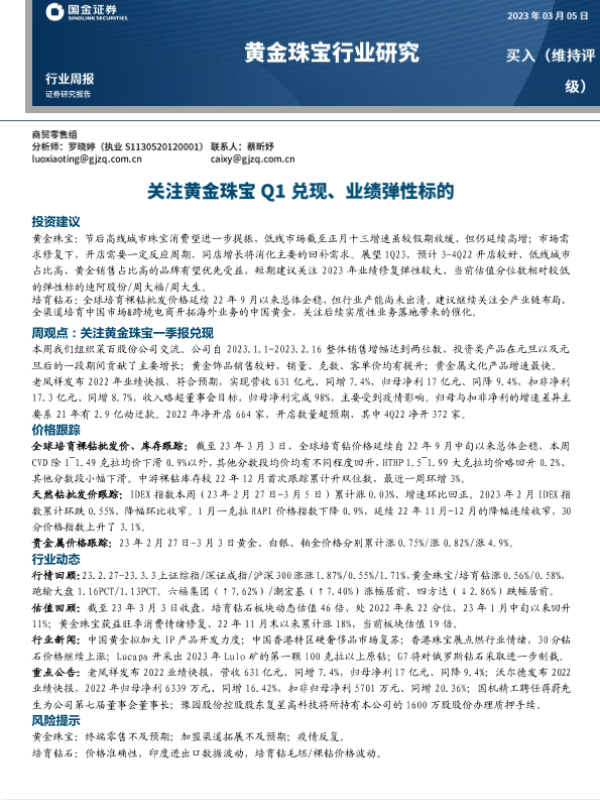 【国金证券】【20230305】20230305-国金证券-黄金珠宝行业研究:关注黄金珠宝Q1兑现、业绩弹性标的-20页