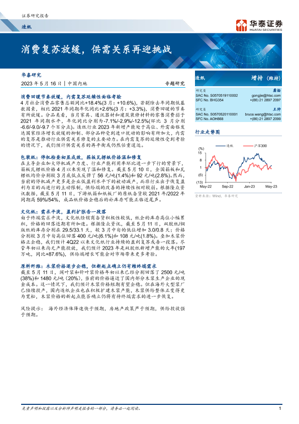 【华泰证券】【20230516】20230516-华泰证券-造纸专题研究:消费复苏放缓,供需关系再迎挑战-16页