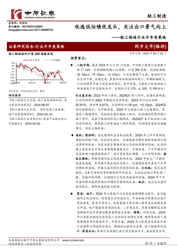 【中原证券】【20240625】20240625-中原证券-轻工制造行业半年度策略:优选低估绩优龙头,关注出口景气向上-32页