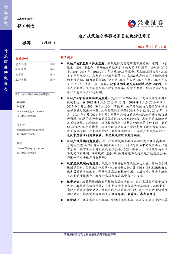 【兴业证券】【20241014】地产政策组合拳驱动家居板块估值修复-20页