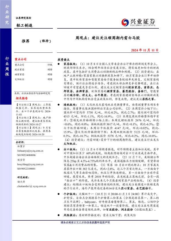 家居板块 个护产品 造纸行业 轻工制造 出口行业