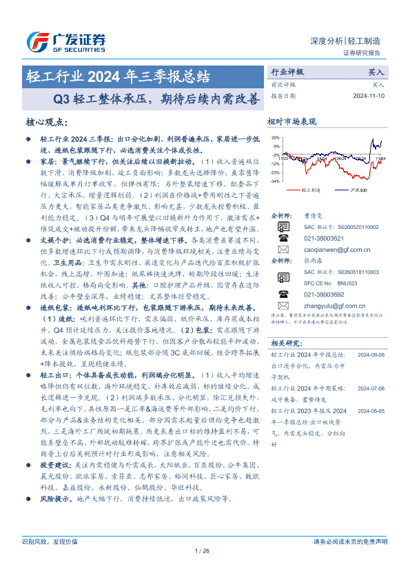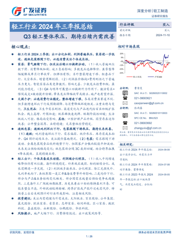 【广发证券】【20241110】轻工行业2024年三季报总结:Q3轻工整体承压,期待后续内需改善-26页