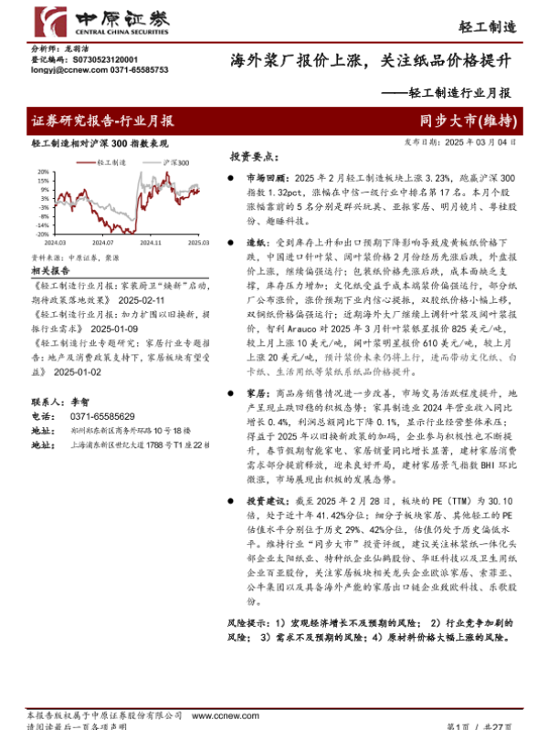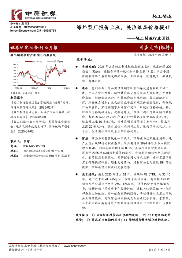 【中原证券】【20250304】轻工制造行业月报:海外浆厂报价上涨,关注纸品价格提升-27页