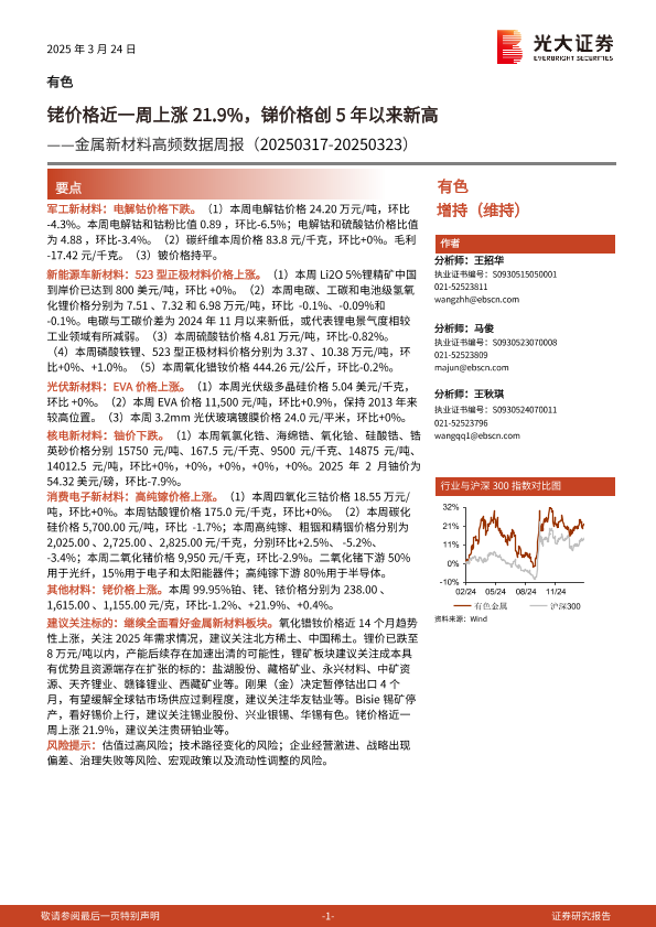 【光大证券】【20250324】有色行业金属新材料高频数据周报:铑价格近一周上涨21.9%,锑价格创5年以来新高-24页