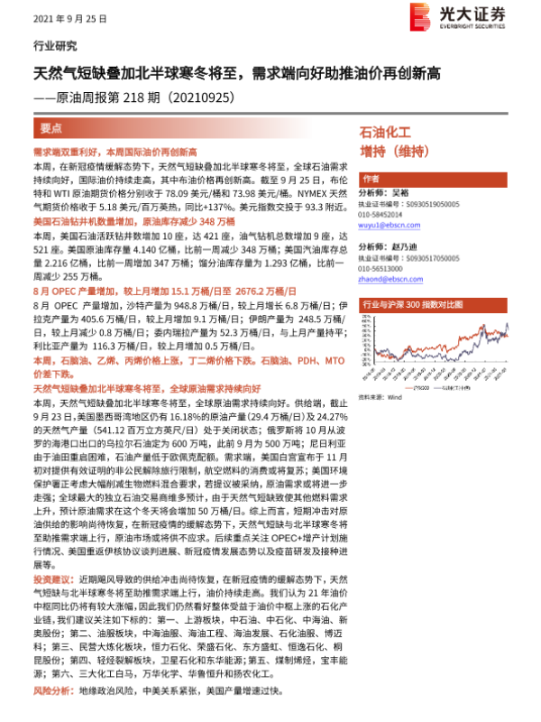 【光大证券】【20210925】20210925-光大证券-石油化工原油周报第218期:天然气短缺叠加北半球寒冬将至,需求端向好助推油价再创新高-11页