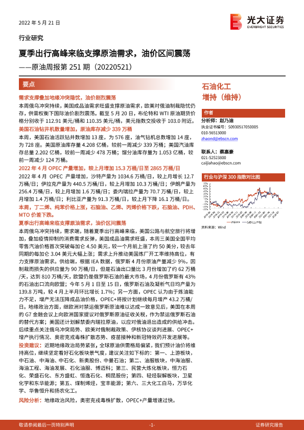 【光大证券】【20220521】20220521-光大证券-原油周报第251期:夏季出行高峰来临支撑原油需求,油价区间震荡-11页