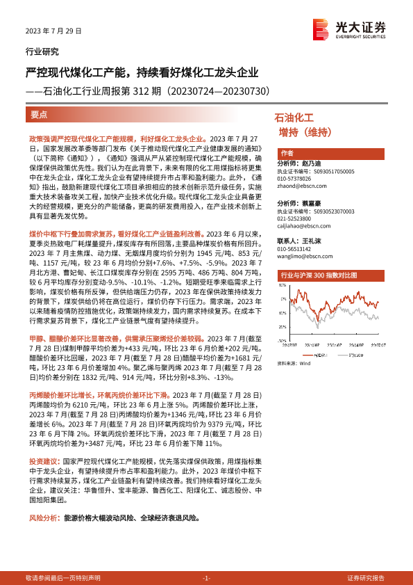 【光大证券】【20230729】20230729-光大证券-石油化工行业周报第312期:严控现代煤化工产能,持续看好煤化工龙头企业-18页